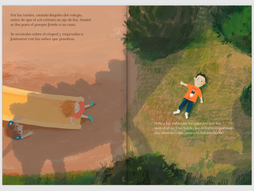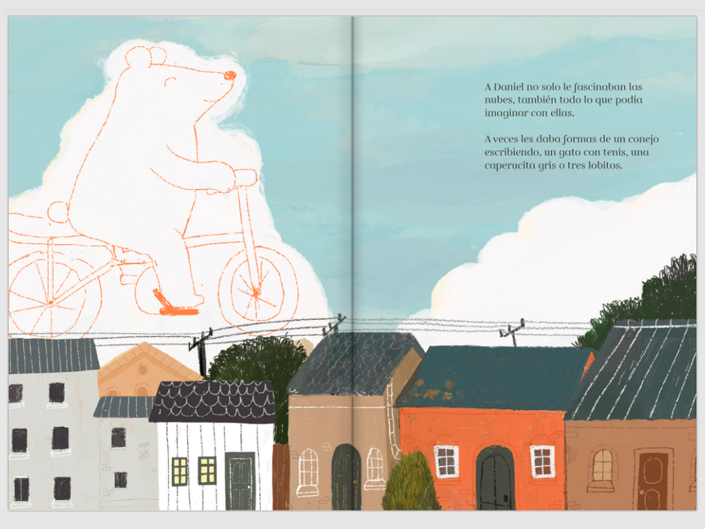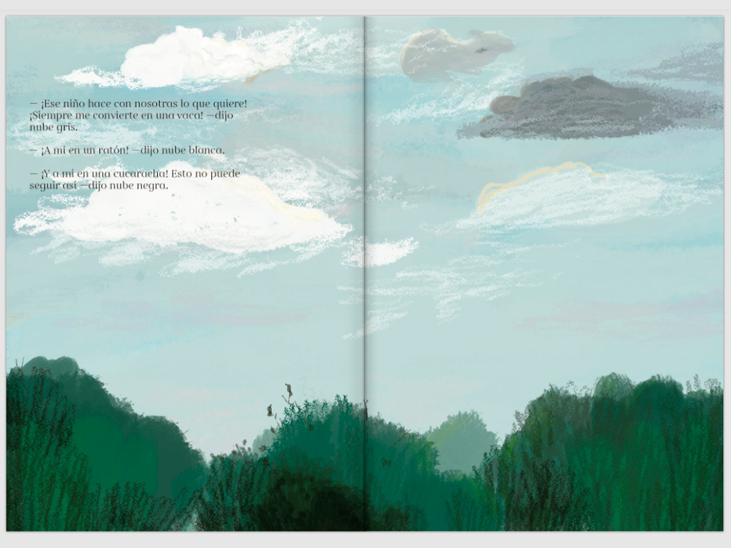 Las Señoras Vaporosas es un libro para los más pequeños. Juega con la mirada infantil haciendo que cada página parezca un retazo del cielo, en el que el cielo se transforma en un teatro de personajes fantásticos.