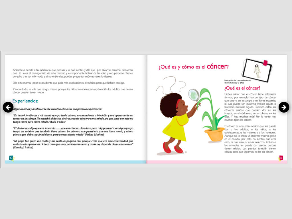Este libro es el resultado de años de investigación y trabajo con niños y adolescentes con cáncer. El libro busca, a partir de la experiencia, acompañar por medio de sus palabras, a menores con cáncer y a sus familias. El niño en algún momento se preguntará por su enfermedad: ¿Cómo es? ¿Por qué me dio cáncer? ¿Qué me van a hacer? ¿Y mi familia, mis amigos y mi escuela?