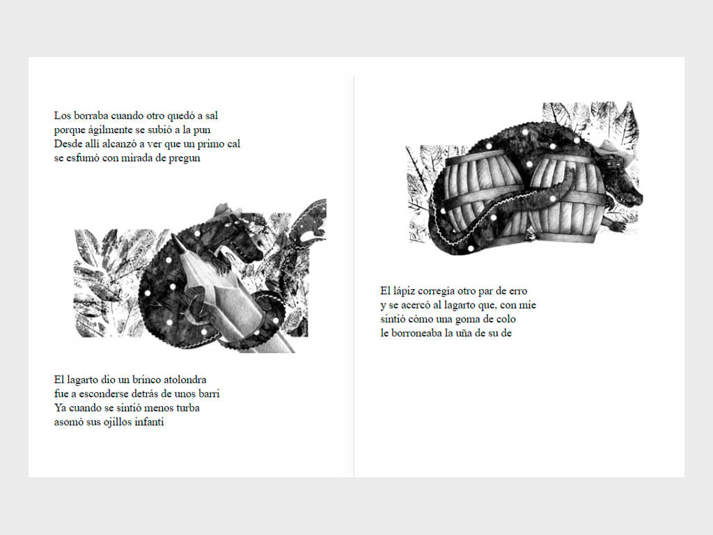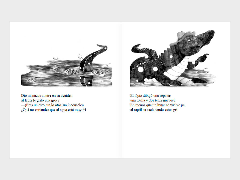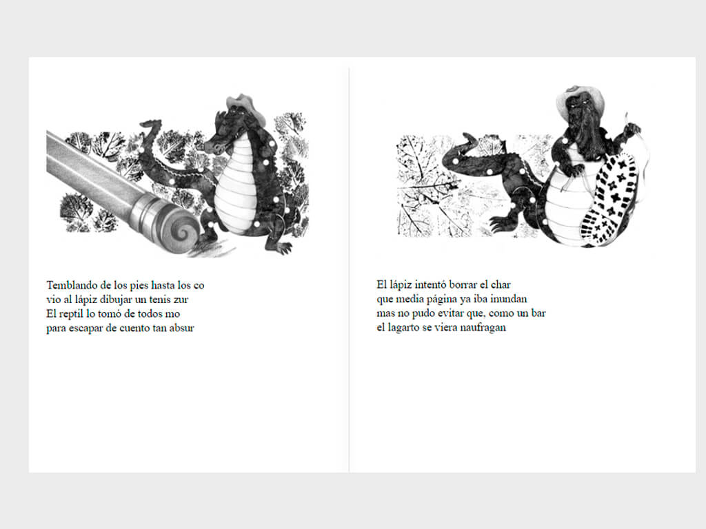 Un lagarto es víctima de un lápiz distraído que se aferra en escribir su relato en prosa. El lagarto sufre porque casi le borra un dedo y lo ahoga en un charco; aunque después se compadece y le dibuja una toalla y tenis nuevos. Al final el lápiz permite que el lagarto termine el relato como él quiera.