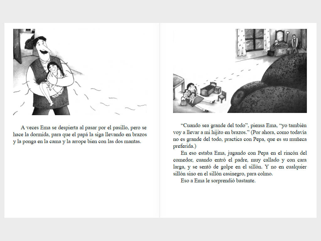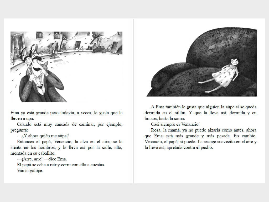 ´´¿Ahora quién me aúpa?´´, pregunta Ema cuando está cansada de caminar. Entonces el papá Venancio la lleva de caballito. Y si se queda dormida en el sillón, también él la lleva en brazos hasta la cama. Un día todo se puso raro. Venancio no llegó silbando como siempre, ni le dio a Ema un beso en la nariz ni le revolvió el pelo con la mano.