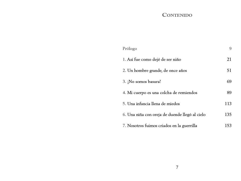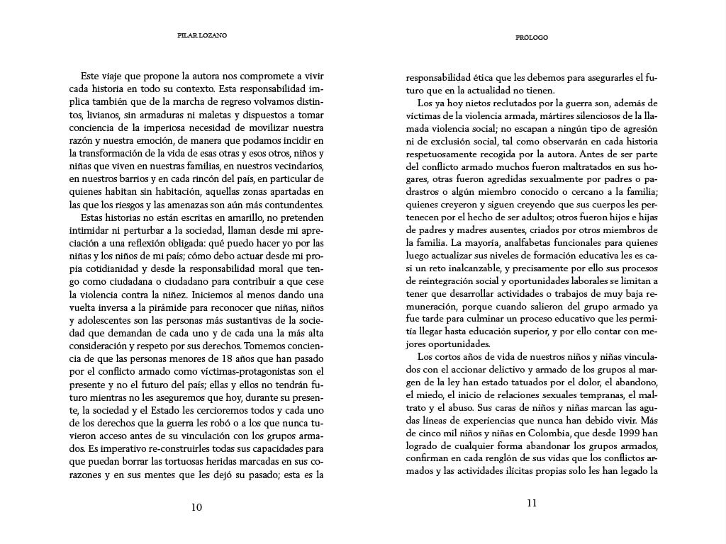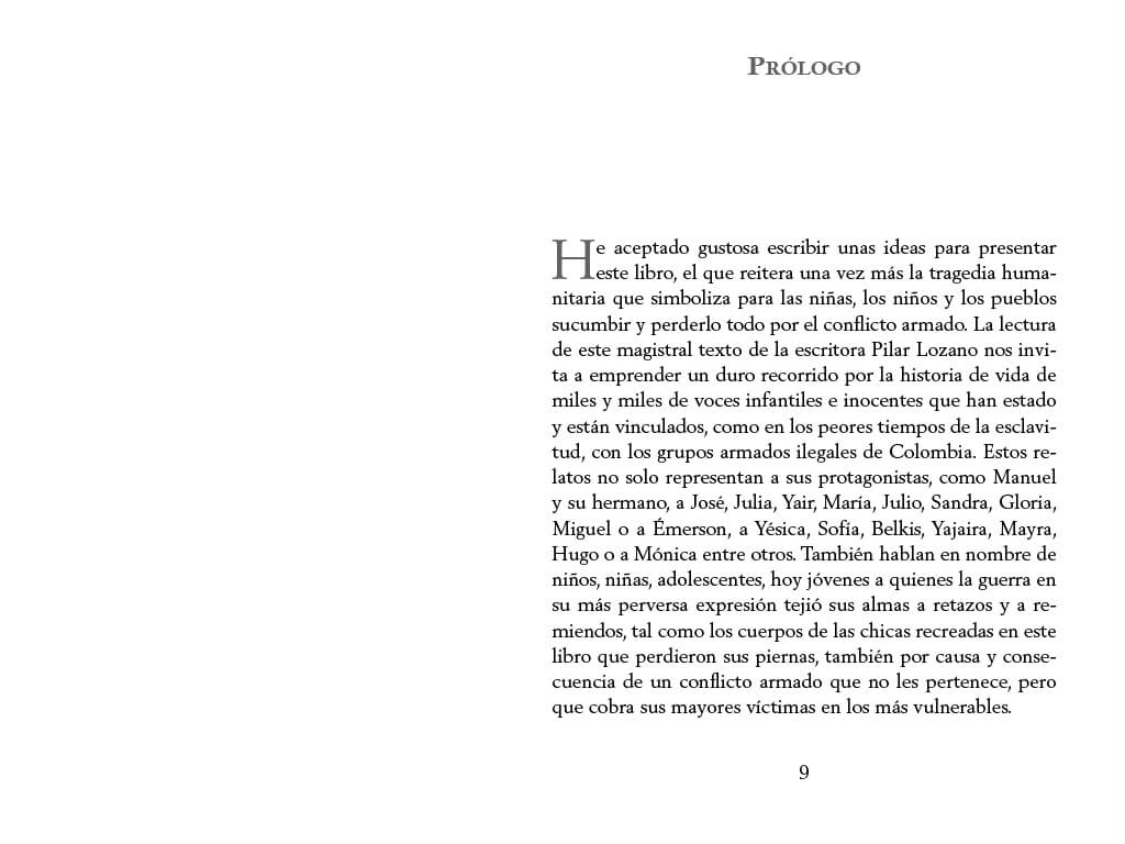 Este libro reitera la tragedia humanitaria que simboliza para las niñas, los niños y los pueblos sucumbir y perderlo todo por el conflicto armado. Es el resultado de muchas jornadas de la periodista tras cada una de las historias, a lo largo y ancho de Colombia. Logra testimonios tan sentidos que muchas veces se confunde el género periodístico con el cuento o la novela.