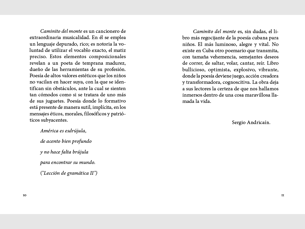 ''Caminito del monte es, sin dudas, el libro más regocijante de la poesía cubana para niños. El más luminoso, alegre y vital.” Sergio Andricaín