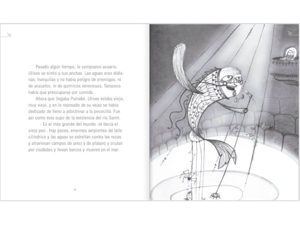 ¿Cuántas veces el ansia por lo desconocido lleva a los seres más cándidos a perpetrar acciones audaces y en no pocas veces de alto riesgo? Puinabe, la delicada pececilla, delicia de la vida de unos infantes ribereños, cree ser feliz en su diáfana pecera, hasta que descubre por medio de su viejo congénere, y de manera por cierto distorsionada, que el mundo más allá de las cristalinas paredes es mucho más interesante. Ante esa arrolladora realidad, es inminente ese idílico viaje que emprende aprovechando los vericuetos del clima que se cierne en pavorosa inundación, trágica para los humanos mas no para ella, que encuentra la oportunidad de explorar ese universo, que no es ni la sombra de lo que ha idealizado.