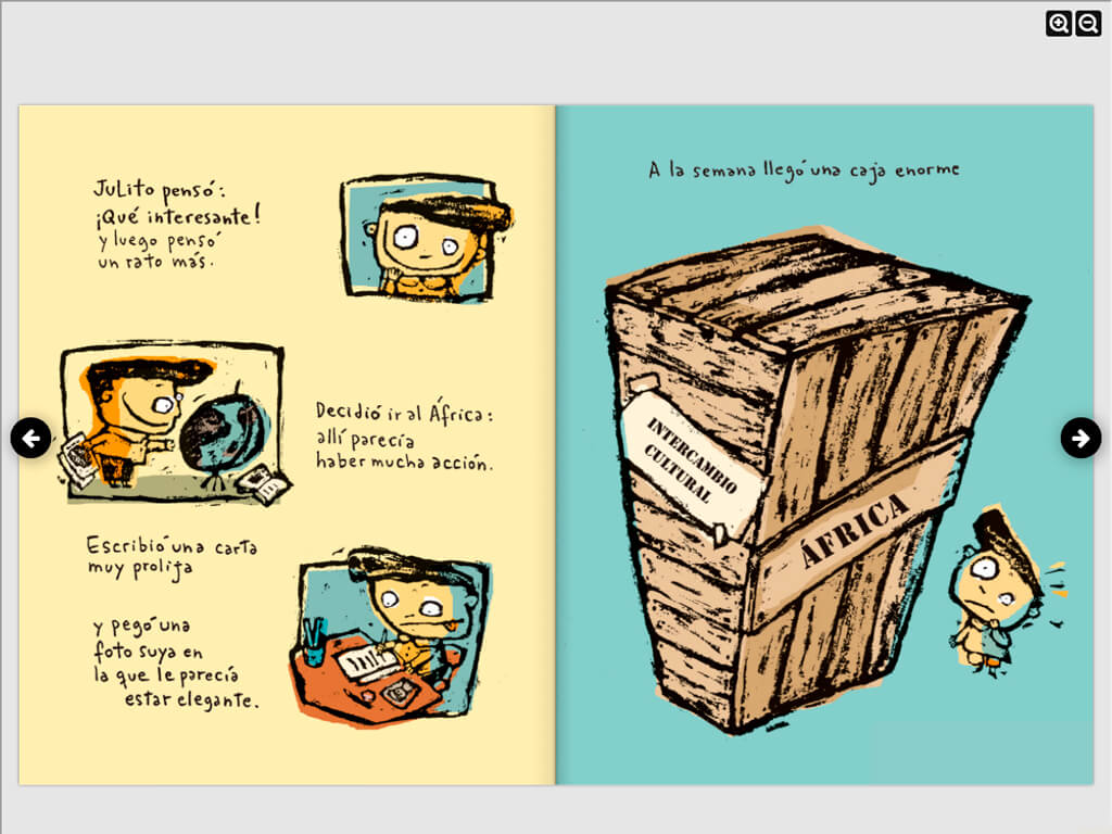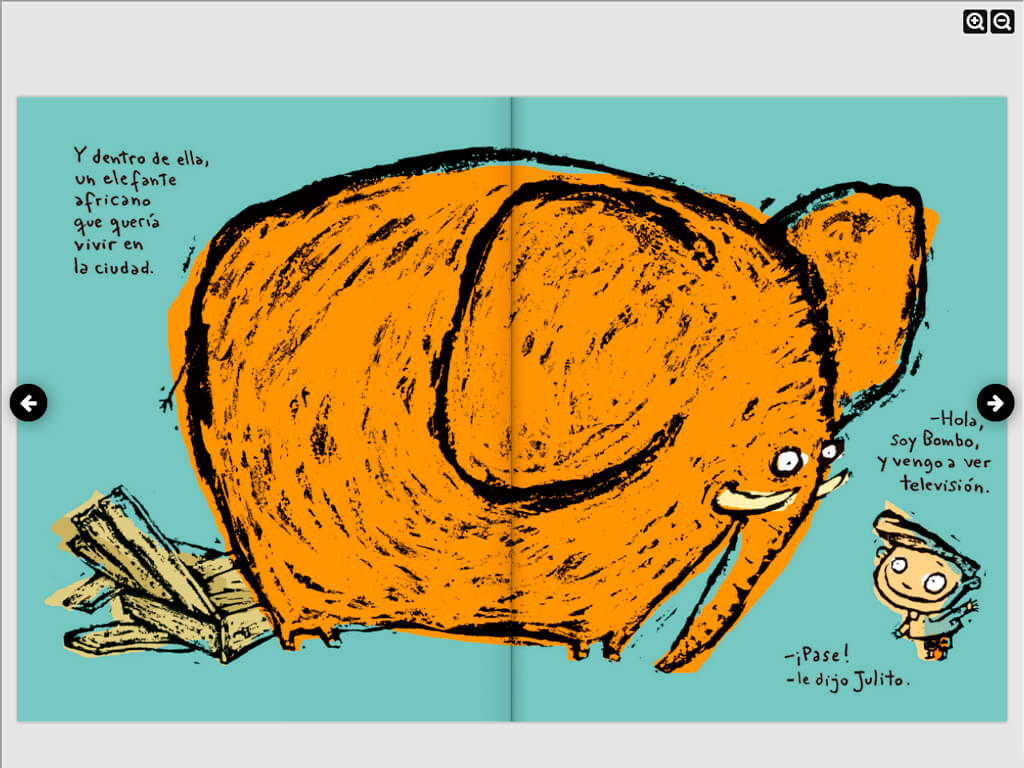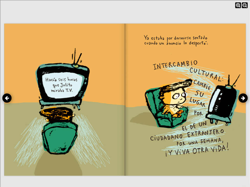 Un día, cuando Julito ya se iba a dormir, vio un anuncio que lo atrapó: “Cambie su lugar por el de un ciudadano extranjero por una semana, ¡y viva otra vida!” Y así fue como Bombo llegó a ver la tele en casa de Julito, y él conoció la selva africana.