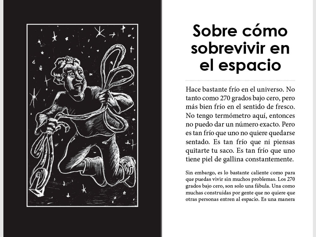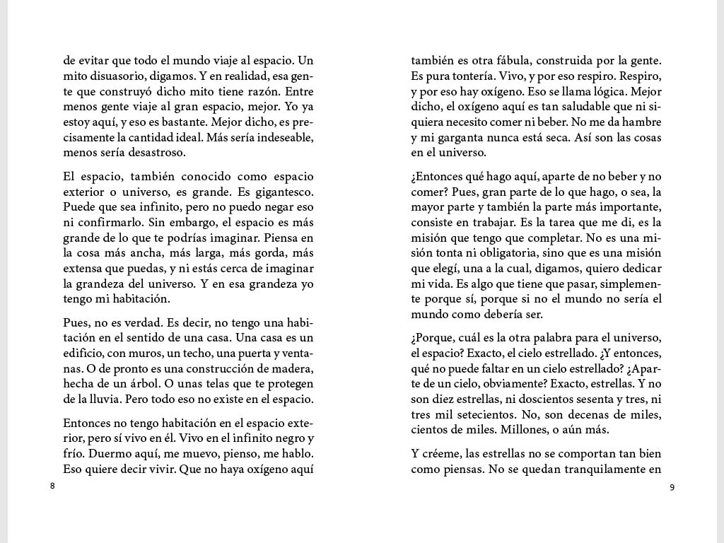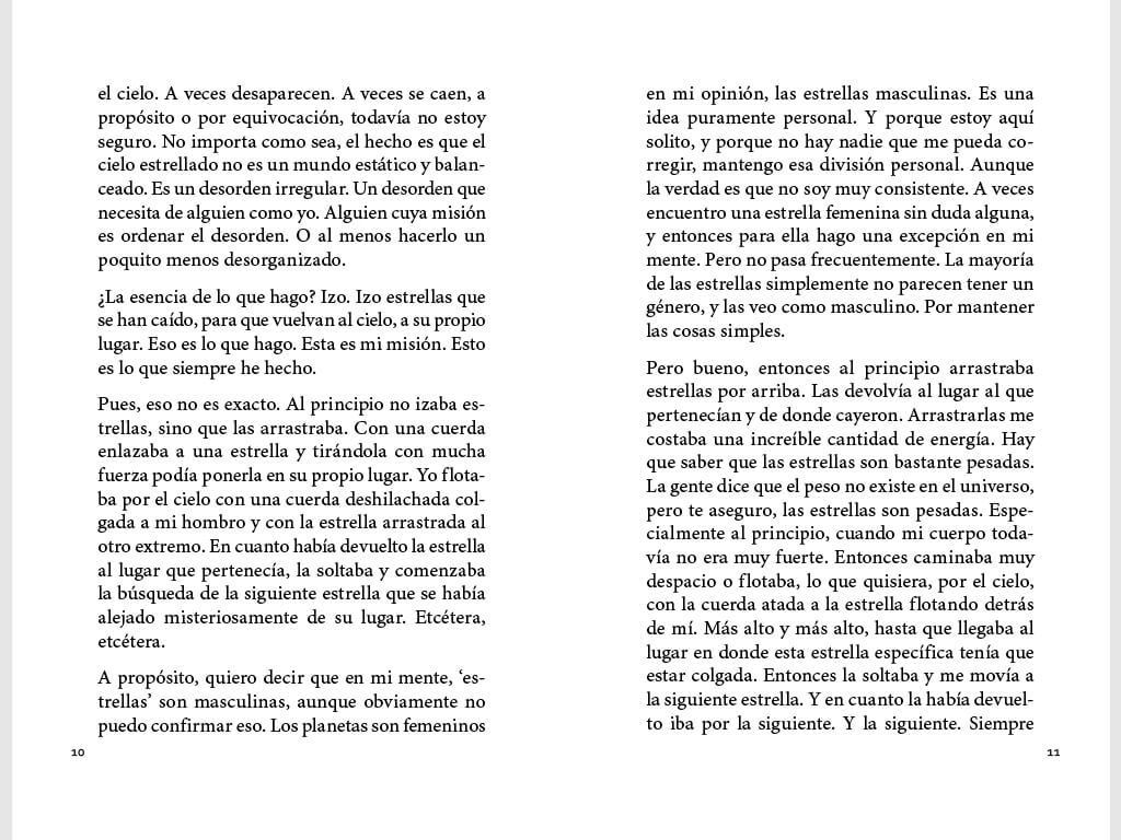 El protagonista de esta historia vive en el espacio exterior y su trabajo consiste es colgar las estrellas que se caen del cielo constantemente. Lleva a cabo su misión en medio de una inmensa calma hasta que algo inesperado ocurre. De vez en cuando intento hacer una estimación de la cantidad de estrellas que existen en el universo. ¿Cien mil? ¿Un millón? No lo sé. Solo sé que constantemente las estrellas se caen y que constantemente yo las recojo. Como me prescribe mi misión. Porque un cielo vacío, eso no lo quiere nadie.
