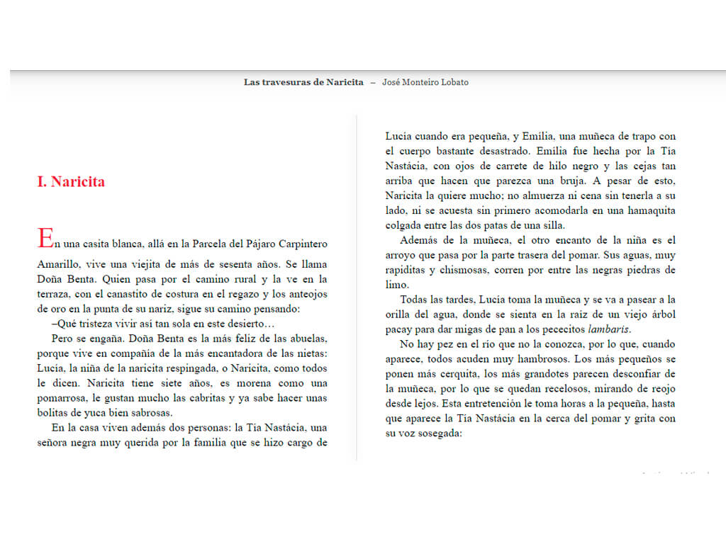 ¿Por qué leer Las travesuras de Naricita? Monteiro Lobato es el más importante de los escritores de literatura infantil brasileña y Las travesuras de Naricita es su libro más reconocido; en él se presentan los personajes más queridos de toda su obra: la abuela doña Benta, Tía Nastacía, Pedrito, la parlanchina muñeca Emília y la querida Lucía, nuestra Naricita.
