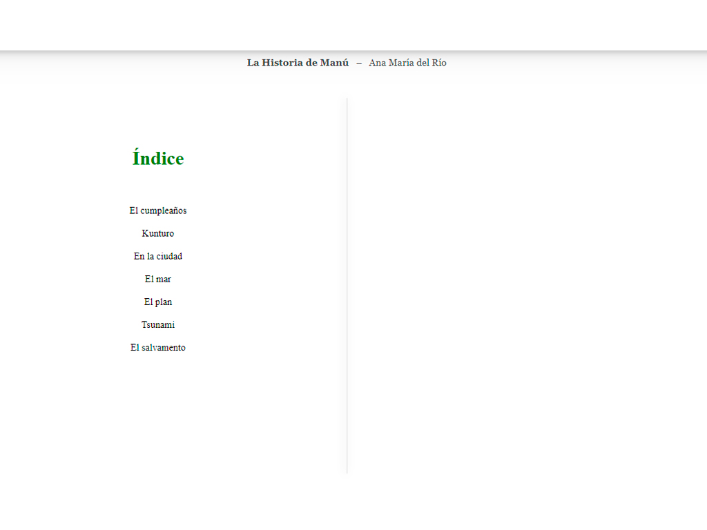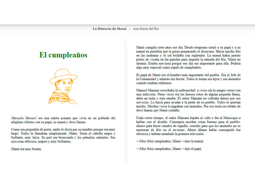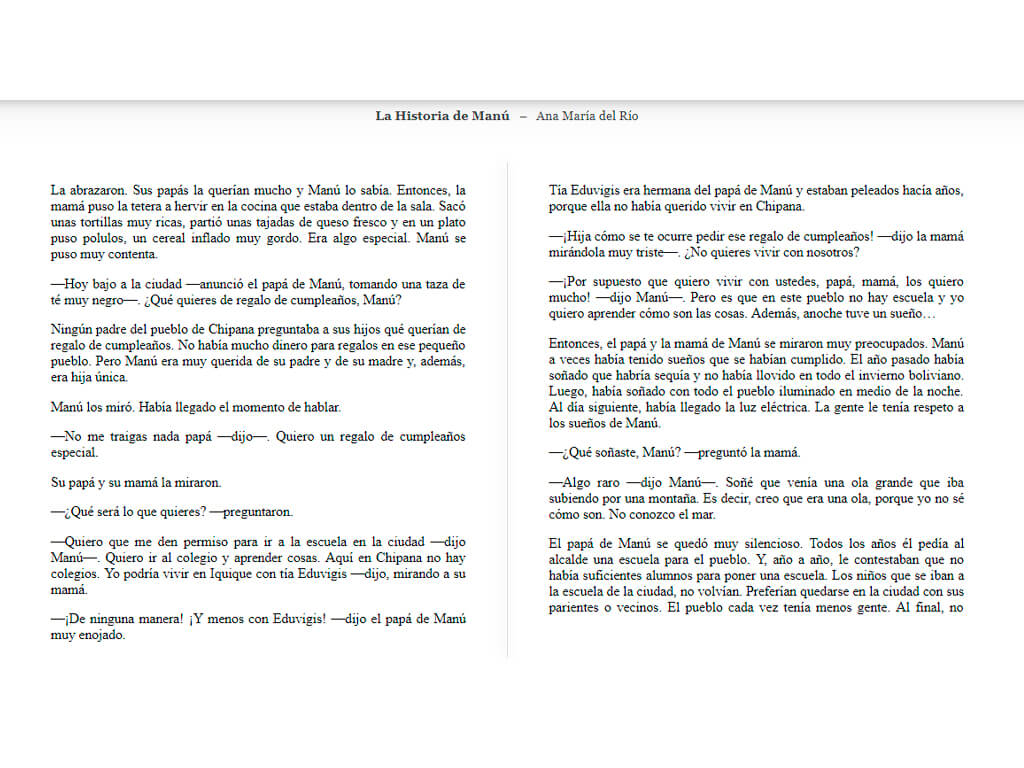Lo que más quiere Manú en el mundo es ir a una escuela de verdad. En su pueblo no hay escuelas y Manú quiere ir a la de la ciudad. Su padre, líder y médico de la pequeña comunidad altiplánica conoce las dificultades que Manú vivirá y no quiere que baje a enfrentar la escuela. Pero Manú se sale con la suya y afronta algo inesperado. En esta profunda y tierna historia de una niña aymara, habitantes de los Andes del norte de Chile, Ana María Del Río ofrece un mensaje profundamente humano para niños y adultos, jóvenes y mayores.
