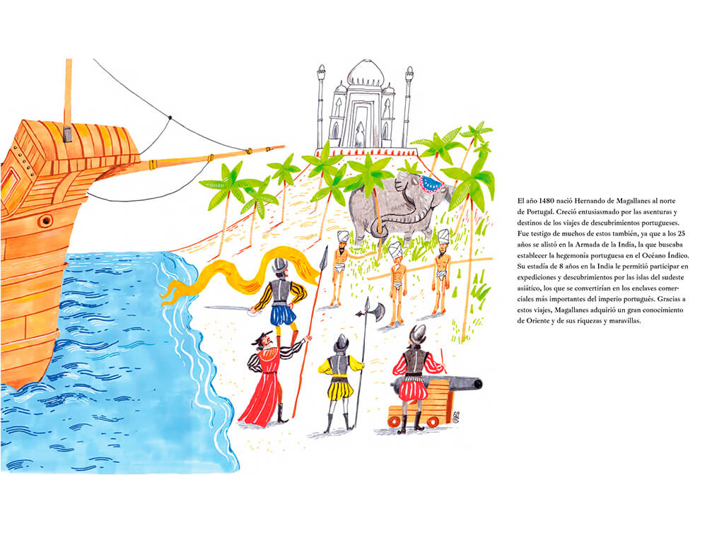 El portugués Hernando de Magallanes fue el primer navegante que emprendió un viaje que daría la vuelta al mundo. Después de sortear cientos de obstáculos y descubrir el estrecho que lleva su nombre, una parada fatal le impidió terminar su travesía la que continuó a cargo de otro importante personaje de la época. Un libro que relata una aventura sin igual que cautivará a niños y niñas.