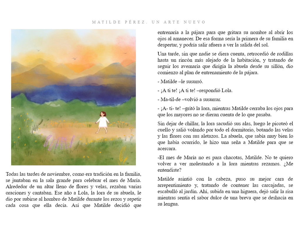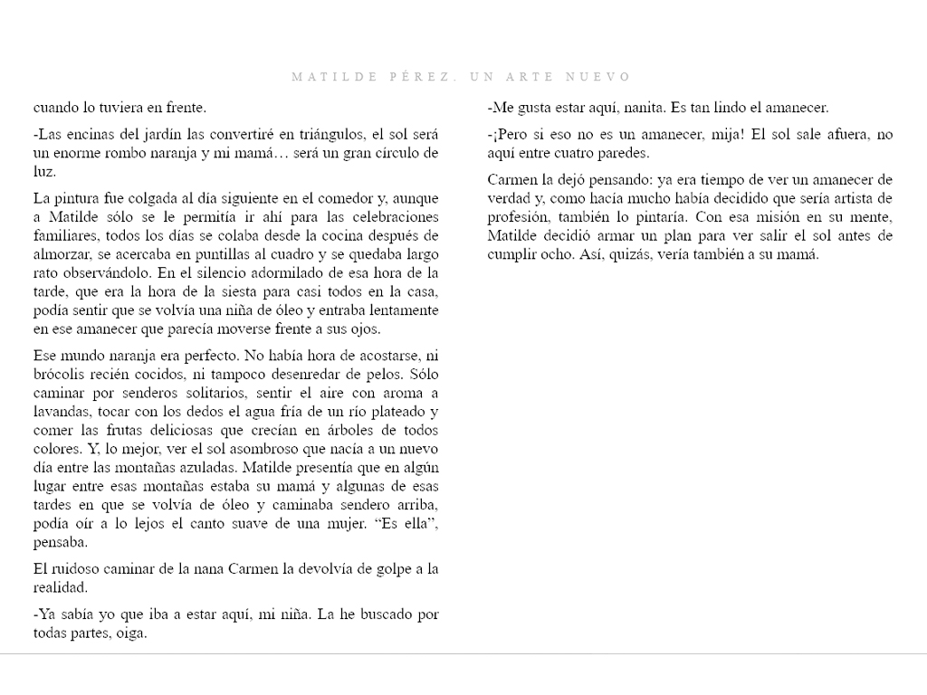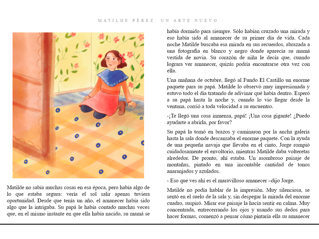Matilde es una niña solitaria que vive en una gran casona de campo. Mientras busca a su madre en el amanecer y juega en las acequias de su infancia, la niña descubre su vocación por el arte y observa en la naturaleza diversas formas que luego plasma en magníficas obras. Esto la convierte en una de las más grandes e innovadoras artistas visuales de la historia de Chile.