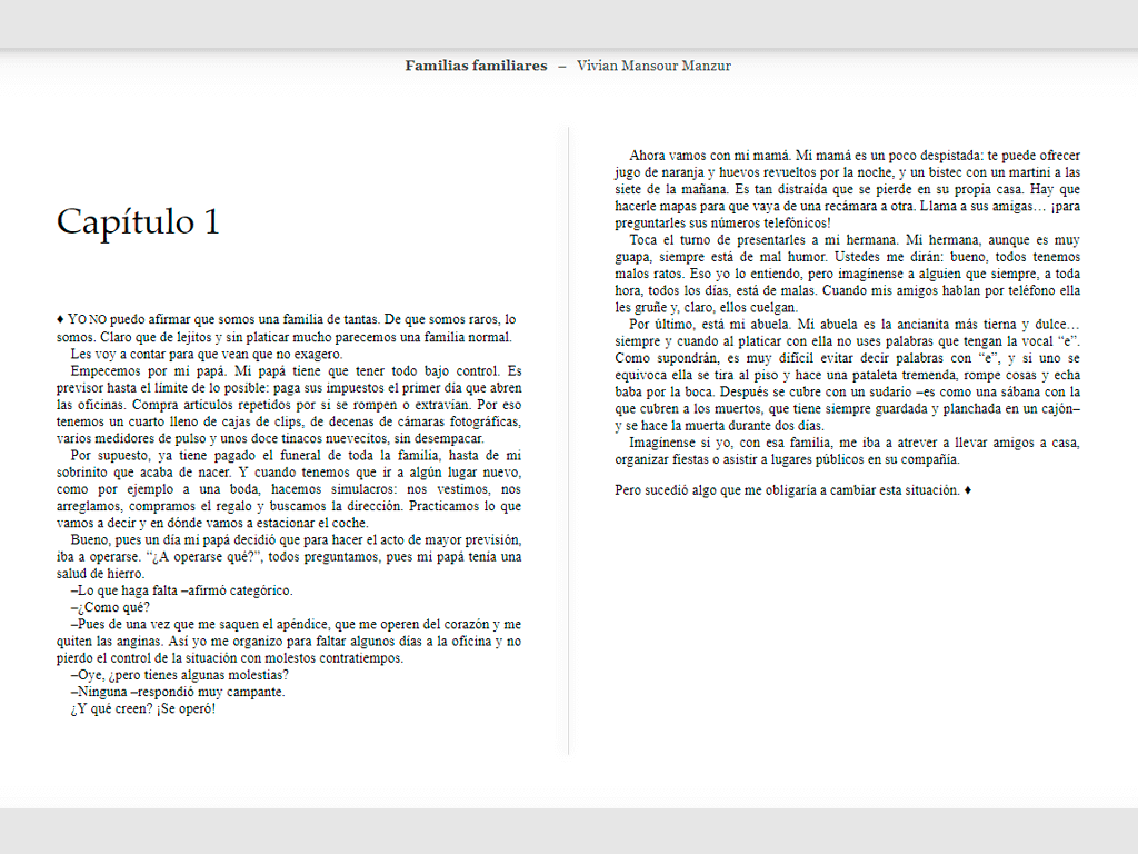 Una familia muy especial: el papá se opera para prevenir enfermedades que no tiene; la mamá necesita un mapa para no perderse ¡en su propia casa! La abuelita se tira al piso y echa espuma por la boca cuando alguien pronuncia una palabra con la letra e; y la hermana, cuando no está enojada, está de malas.