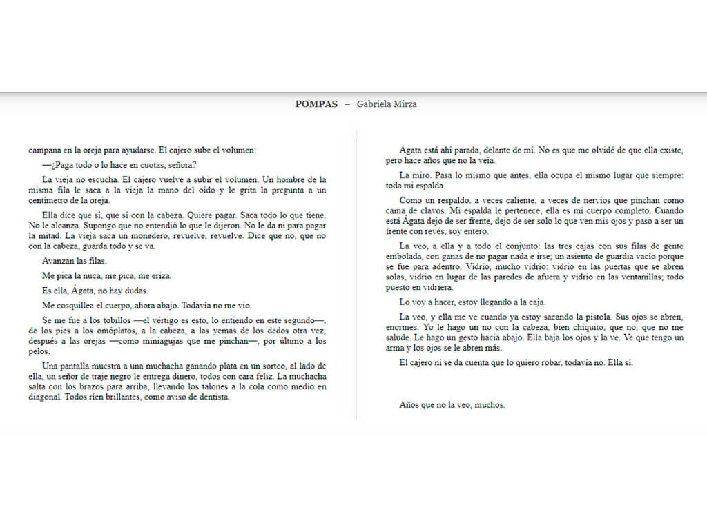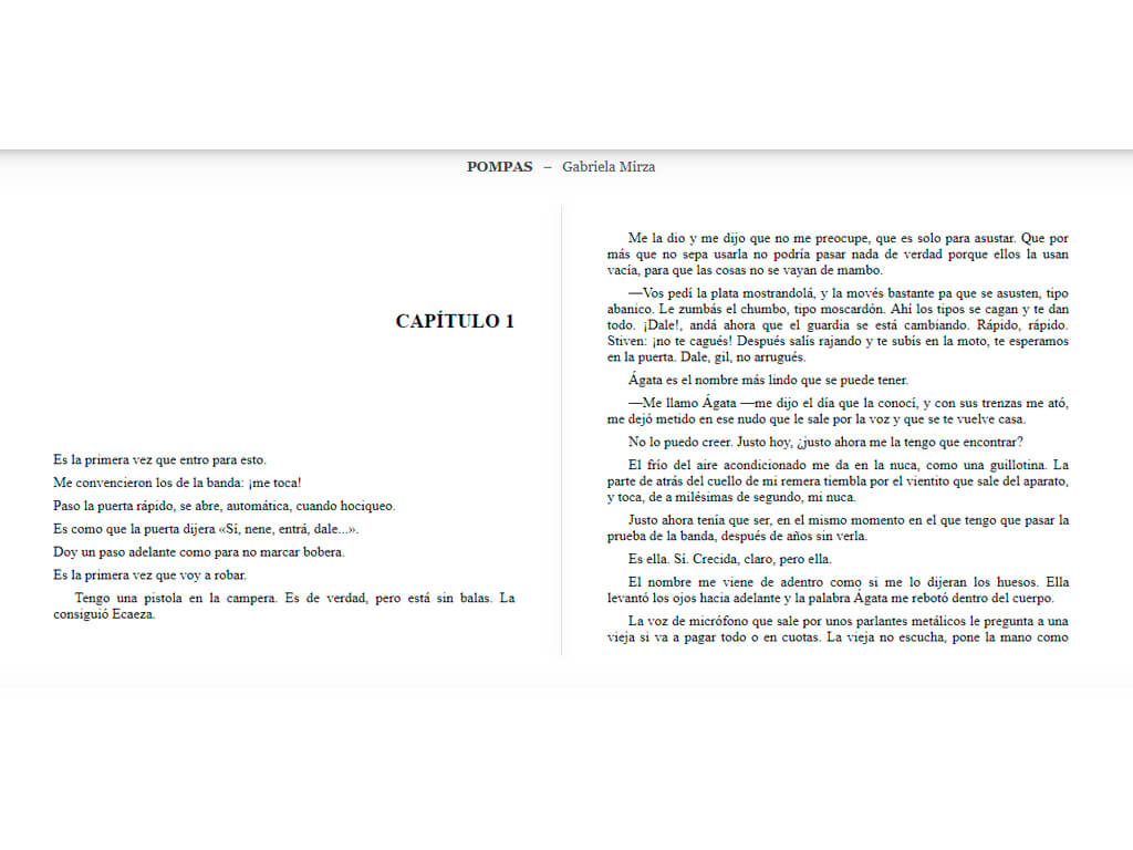 En el Montevideo de hoy, Stiven, un joven aprendiz de pandillero, se enfrenta a su prueba iniciática. Con una pistola descargada en el bolsillo, entra al establecimiento indicado para robar… con lo que no contaba es que en el lugar está Ágata, el amor de su vida. A partir de ese encuentro fortuito, el joven reconstruye su corta vida y las piezas de su memoria dan forma a una imagen dura y violenta, como un espejo deformante a punto de romperse. Esta novela breve aborda los retos de hacerse adulto, sobre cómo sobrevivir en un entorno adverso y sobre el amor que salva.