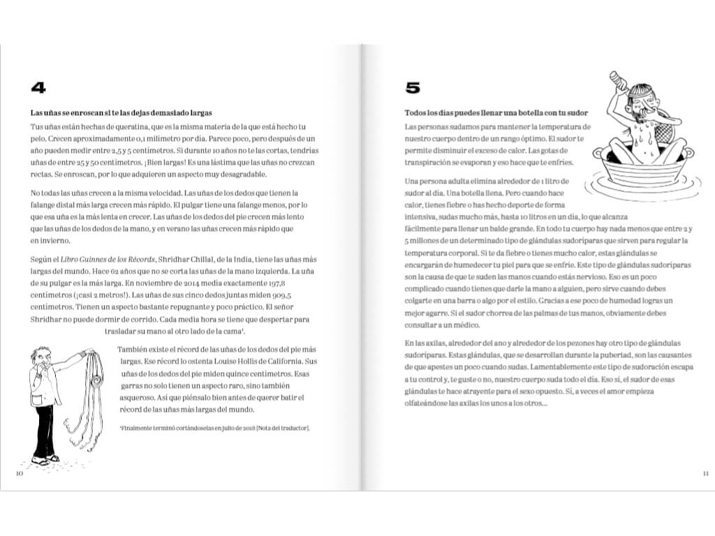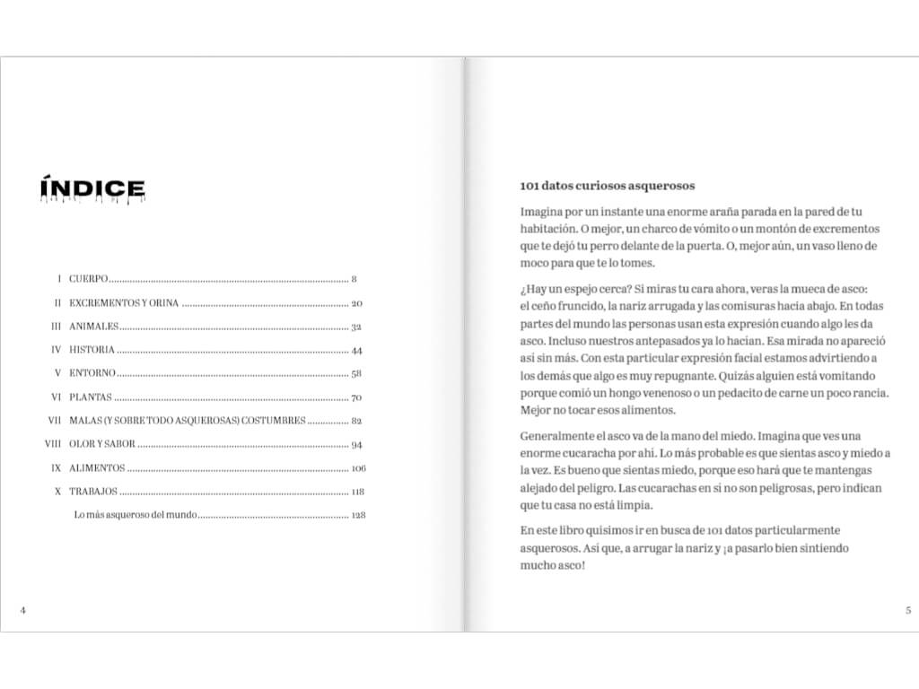 ¿Sabías que todos los días te tragas alrededor de una taza de mocos? ¿O que el Rey Sol, Luis XIV, recibía visitas mientras estaba sentado en el baño? ¿O que, si tienes los labios secos, una de las mejores soluciones es echarles cera de oreja? ¡Qué asco! Ahora imagina una enorme araña parada en la pared de tu habitación. O mejor, un charco de vómito o un montón de excrementos de tu perro. ¿También te parece asqueroso? En este libro quisimos ir en busca de 101 datos particularmente asquerosos, divertidos y entretenidos. Y entender qué son y de qué se tratan. Así que, ¡a arrugar la nariz, a pasarlo bien y a aprender, sintiendo un poco de asco!