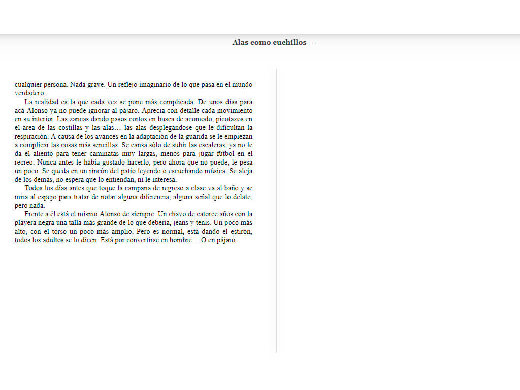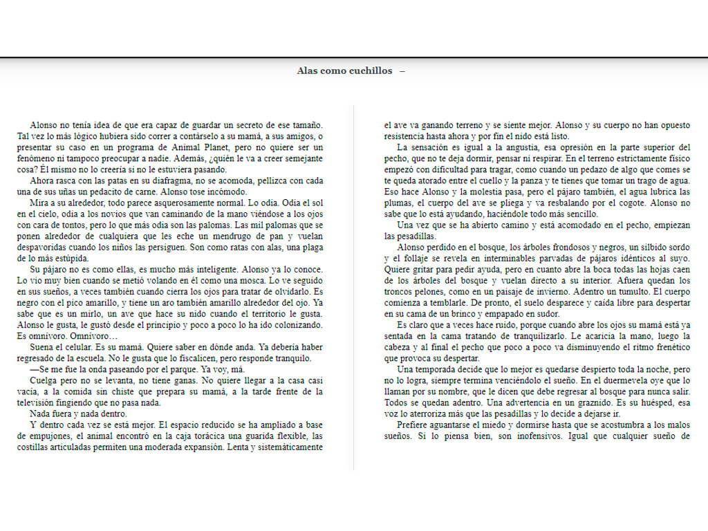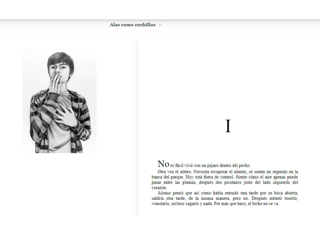 “No es fácil vivir con un pájaro dentro del pecho”. Así inicia Alas como cuchillos, una historia sobre el dolor de la pérdida, los cambios y transiciones que implica la adolescencia y cómo sería vivir con un mirlo negro instalado entre las costillas. Cuando Alonso, el protagonista, siente que la vida ya no puede ponerse más difícil, una extraña compañía lo obliga a indagar qué pasa dentro de sí, qué es eso que duele o molesta tanto. La autora nos “cose” el libro al pecho, sus personajes y conflictos, con un hilo muy delicado, transparente, imposible de cortar. Una sola advertencia para leer Alas como cuchillos: no hacerlo sobre una almohada de plumas; nunca se sabe.