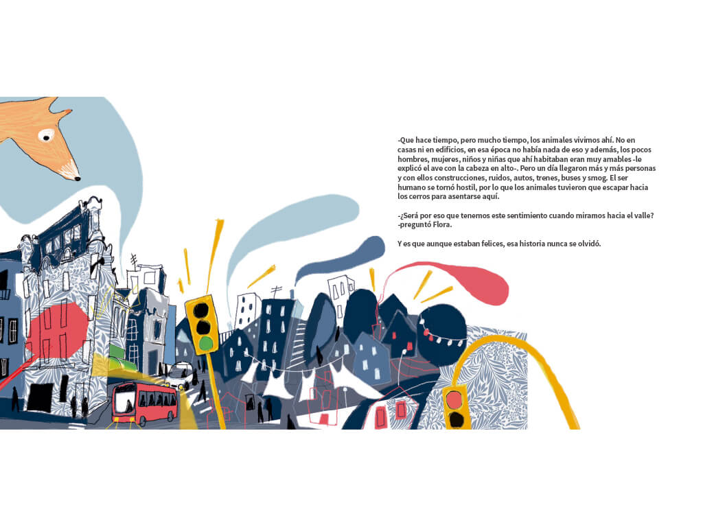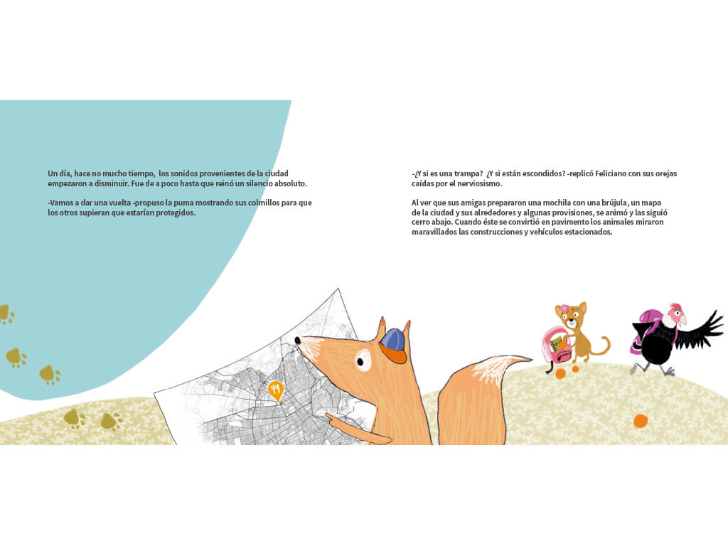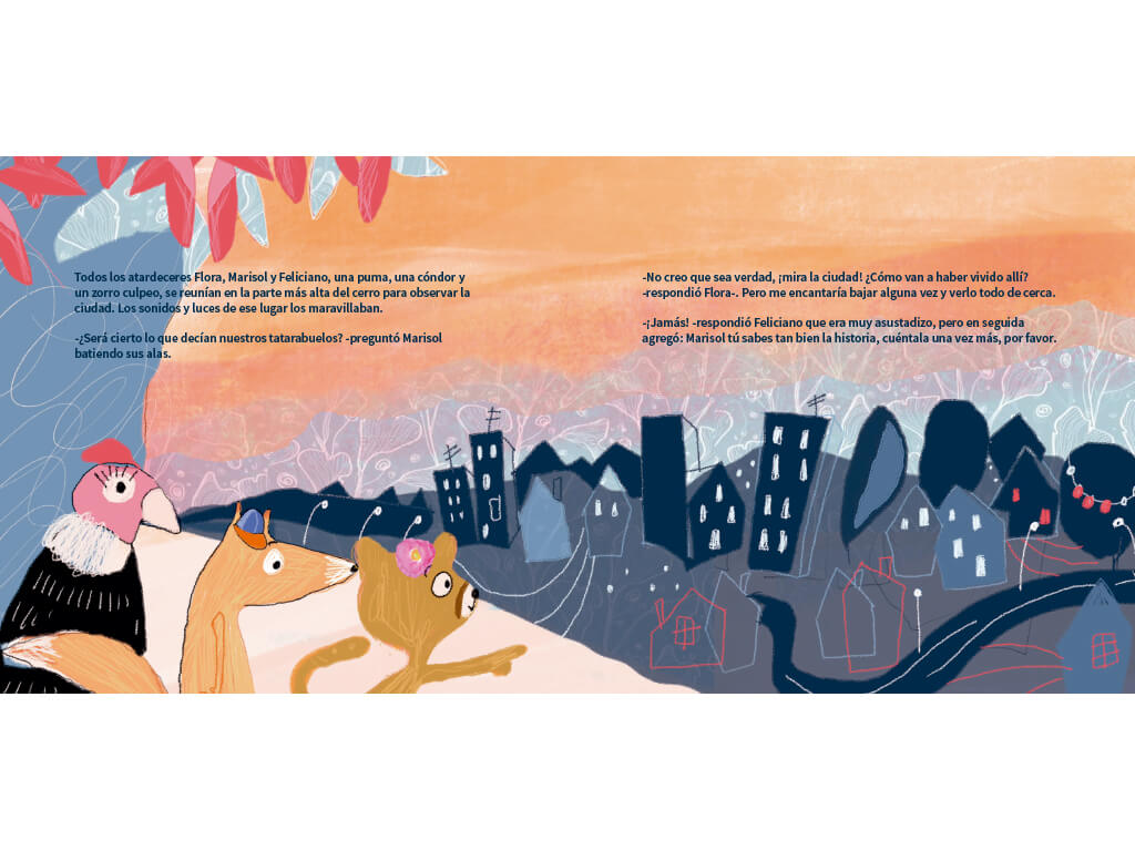 Un día, Flora, Marisol y Feliciano -un puma, un cóndor y un zorro culpeo- descubren que la ciudad que ven desde arriba se silenció y deciden salir a explorar aquel lugar que alguna vez habitaron sus antepasados. En plena pandemia, estos tres amigos vivirán una aventura sin igual recorriendo la gran ciudad deshabitada que los sorprenderá con eventos inimaginados y que quedarán para siempre en sus recuerdos. Un libro lleno de humor y color.
